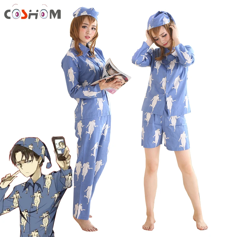 Special Offer Coshome Levi piżamy piżamy atak na Titan piżamy Shingeki No Kyojin kostiumy Cosplay dorosłych Pijamas topy spodnie z kapeluszami Discount 30% Today!
